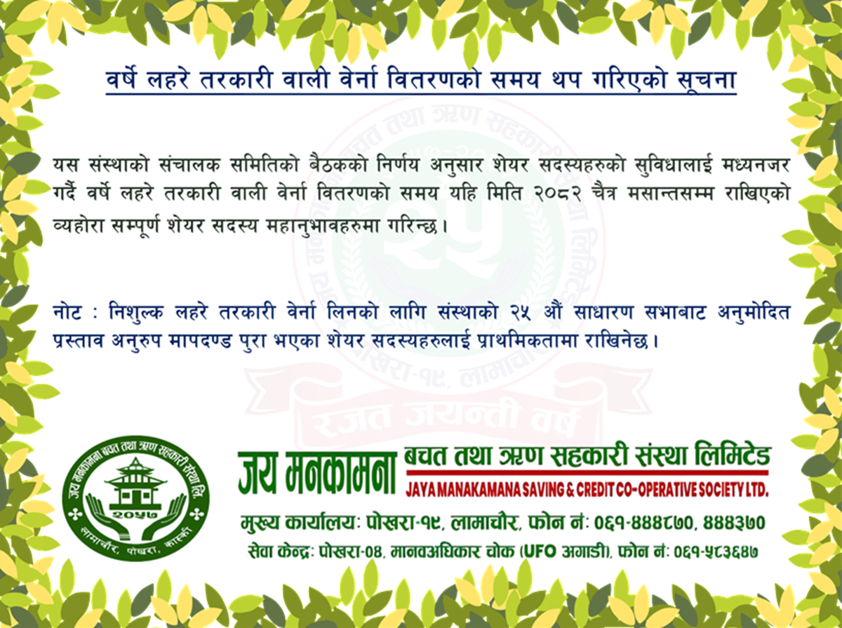 वित्तिय संस्था संचालन प्रक्रियालाई जिवन्त रुप दिन संस्थामा कार्य गर्ने सिंगो व्यवस्थापनको क्षमता चुस्त, दुरुस्त, पारदर्शी लगनशिल र सिकेका सिपहरुको कार्यान्वयनमा ध्यान दिई उत्पादकत्वमा वृद्धि गर्न सक्षम हुनुपर्छ । आजको यो प्रतिस्पर्धात्मक र उत्कृष्टताको समयमा संस्थाको फराकिलो सोचलाईपुरा गर्नको लागि निश्चित रुपमा जय मनकामना साकोसको व्यवस्थापन निक्कै नै सक्षम, गतिशिल, प्रभावकारी र आधुनिक हुन जरुरी छ भन्ने कुरामा सचेत रहँदै व्यवस्थापनको नेतृत्वदायी भूमिकाको हैसियतले प्रभावकारी व्यवस्थापन संस्कारको विकास गर्दै संस्था को रणनीतिक योजनाहरुद्वारा समुदायमागुणस्तरीय, सदस्य केन्द्रित, वित्तीय सेवा प्रदान गर्ने प्रतिवद्धता व्यक्त गर्न चाहन्छौं । साथै हामी व्यवस्थापन पक्षले आगामी दिनमा संस्थाको सेवालाई स्वच्छ, प्रतिष्पर्धी, प्रविधिमैत्री, छिटो छरितो बनाउदै, यहाँले दिनुभएको जिम्मेबारीलाई पुर्ण रुपमा सदुपयोग गरी सहकारी सिद्धान्तलाई शिरोपर गर्दै यस संस्थालाई प्रदेशकै नमुना सहकारी बनाउन हाम्रो हरदम प्रयास रहने नै छ । यस अभियानमायहाँहरुको साथ र सहयोगको अपेक्षा गर्दे सुरक्षित, भरपर्दो र नमूना संस्थाको रुपमा अझैं चिरपरिचित बनाउँदै लैजाने प्रतिवद्धता व्यक्त गर्न चाहन्छौं ।जय सहकारी